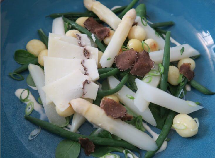 Deze bijzondere (vegetarische) salade met asperges, gebakken krielaardappeltjes, ciabatta croutons, haricots verts en stukjes milde versie Pecorino (schapenkaas) met een romige dressing van homemade truffelmayo is echt een aanrader. Een luxe voorjaarsfeestje op je bord!