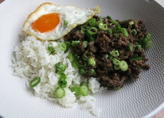 Chinees comfortfood in een kommetje. Roergebakken rundergehakt in een saus met traditionele Chinese smaakmakers (soja-saus, oestersaus, Shaoxing rijstwijn) en erwtjes, samen met een gebakken eitje bovenop een kommetje met rijst.