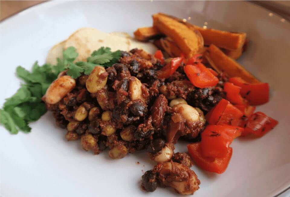 In deze heerlijke veganistische chili vind je een mix verschillende soorten bonen, die ik stoof in een kruidige saus met o.a. gedroogde Mexicaanse chipotle pepers, kaneel, komijn, tomaat en paprika. De zoete aardappel rooster ik in de oven en combineert heerlijk met de rokerige iets pittige smaak van de chili.