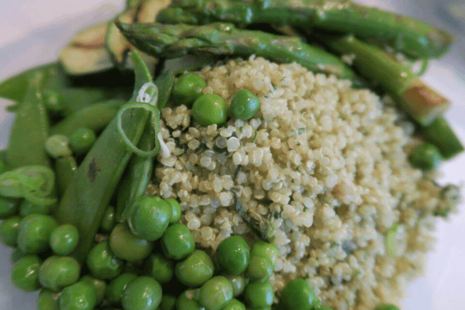 Quinoa, lente-ui, groene asperges, sugarsnaps, erwtjes, courgette, knoflook, pijnboompitten, Parmezaan, Pecorino, olijfolie, citroen, basilicum, peper en zout.