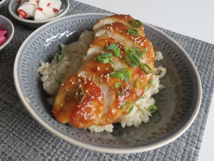De marinade van deze – in de oven gebakken – kipfilet is een eeuwenoude smaakcombinatie van miso, mirin en sake (miso dengaku). Traditioneel gebruikt als smaakmaker voor groente en tofu en ook verrassend lekker voor kip. Voor erbij maak ik een salade van geroosterde courgette in Japanse stijl en zachte, smeuïge sushirijst (takikomi gohan); een soort Japanse risotto, op smaak gebracht met gekarameliseerde uitjes en sojasaus.
