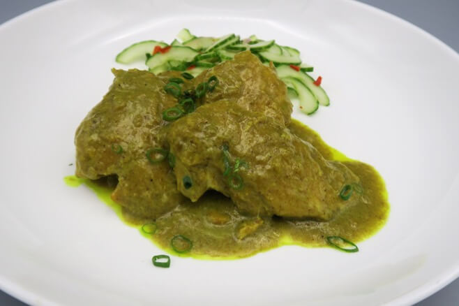 Kari Ayam (Indonesische kipkerrie) geserveerd met atjar ketimoen en rijst