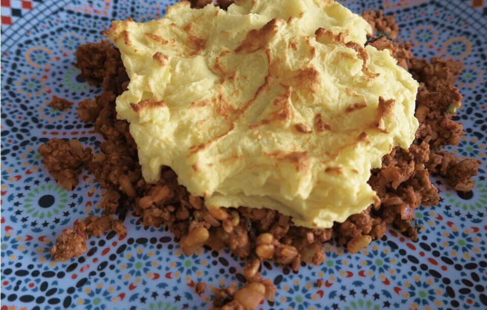 Oosterse shepherd’s pie (ovenschotel met gekruid lamsgehakt en puree) geserveerd met knolselderij remoulade