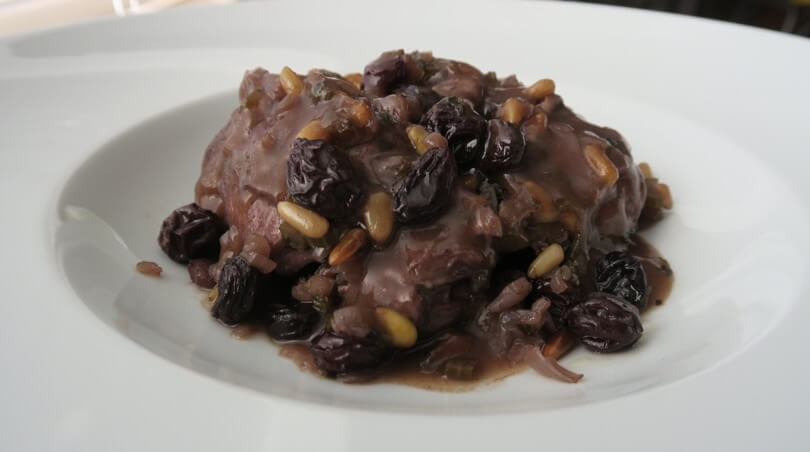 Pollo alla chiantigiana (kip gestoofd in rode wijn met salie, rozijnen en pijnboompitten)