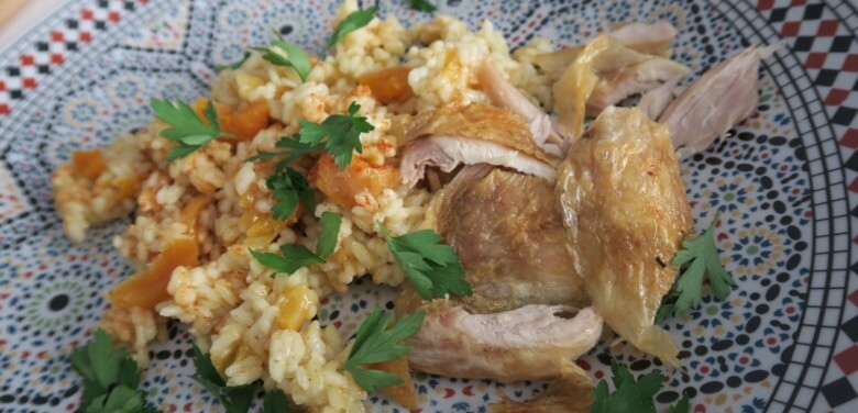 Spaanse rijstschotel met abrikozen, sinaasappel en komijn, geserveerd met krokante kip