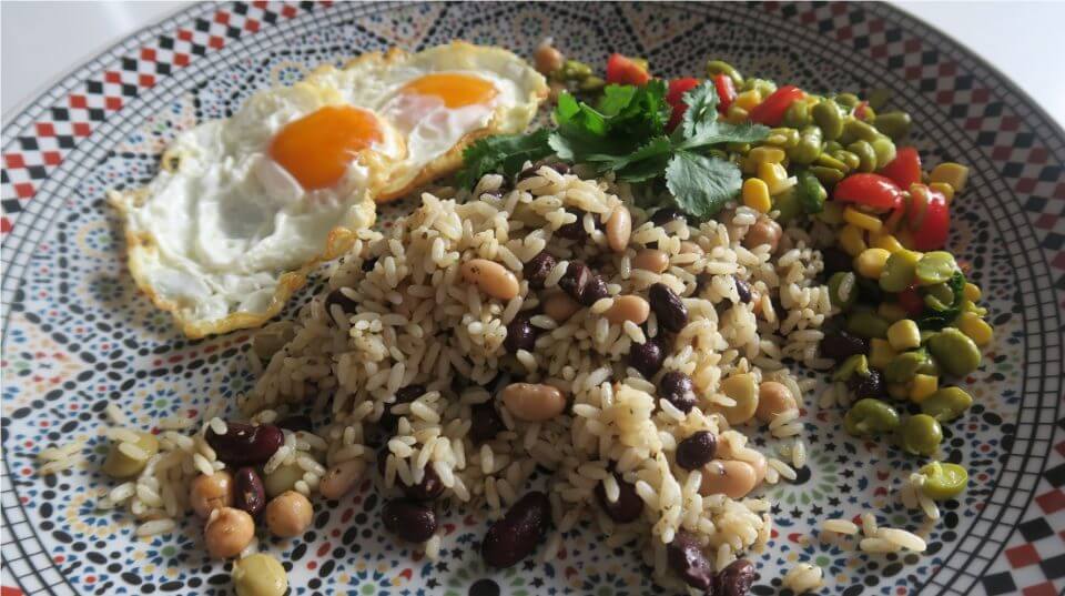 Tacu Tacu (Peruaanse rijstschotel) met gemengde bonen, spicy tomatensaus en solterito (tuinbonensalade)