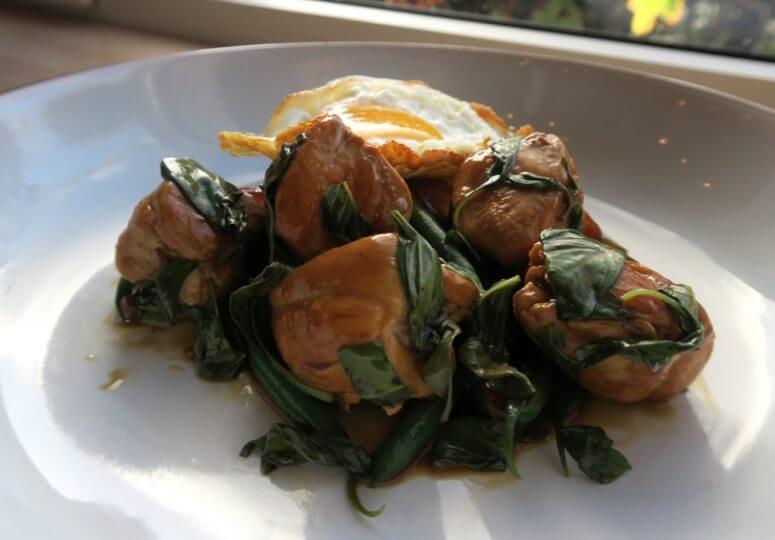 Malse stukjes kipfilet, roergebakken naar een traditioneel Thais recept met behoorlijk wat chilipepers (net genoeg om niet te pittig te zijn), knoflook, sojasaus en oestersaus en als belangrijkste smaakmaker een ruime hoeveelheid kruidige Thaise basilicum. Ik voeg nog wat boontjes toe, niet authentiek, maar wel heel lekker.